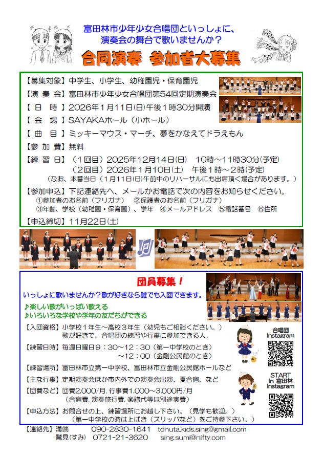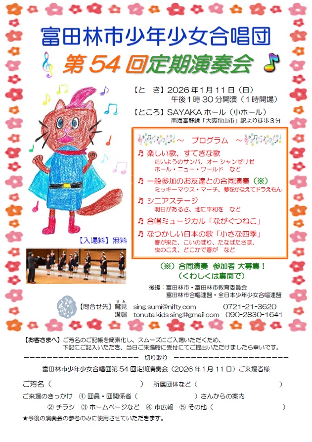 来年1月11日の1時半~(1時開場)、さやかホール小ホールで富田林市少年少女合唱団による「第54回定期演奏会」が開催される。