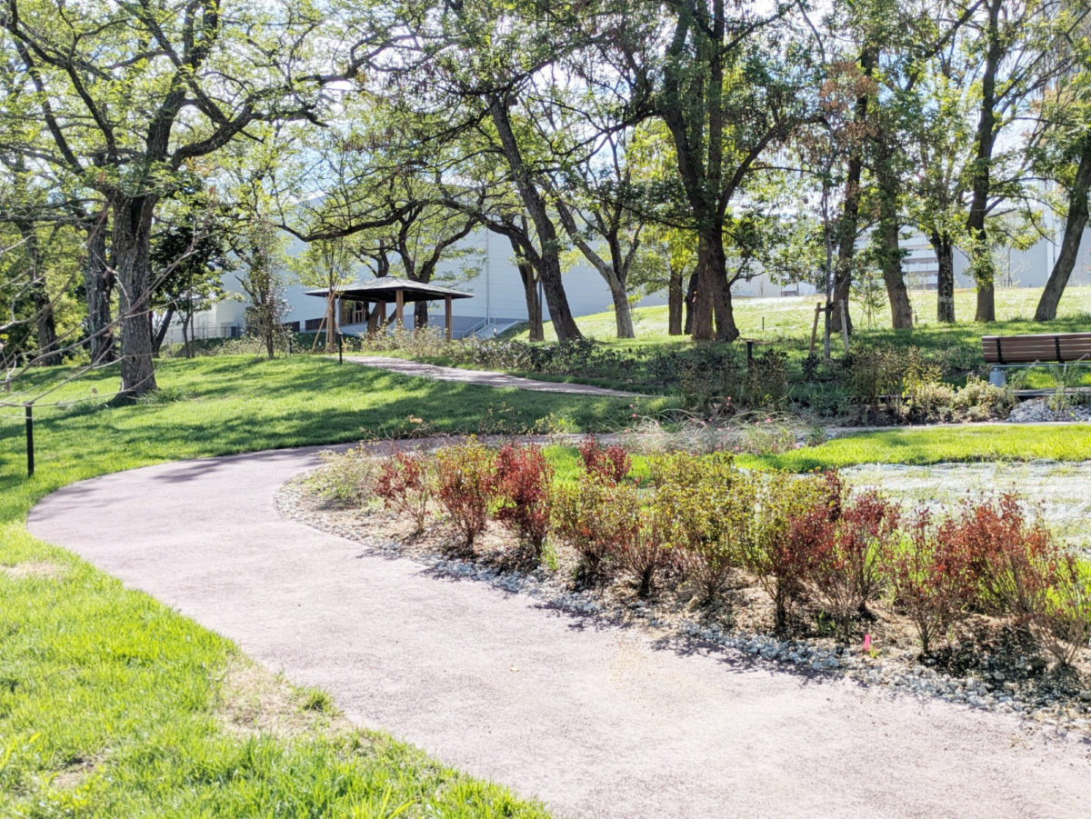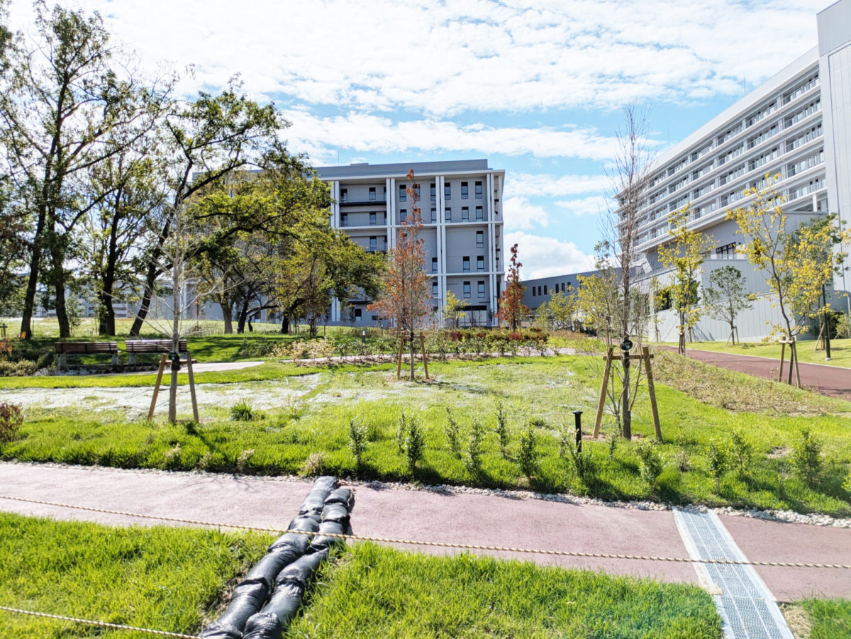久しぶりに泉ヶ丘の近大病院建設現場の横を通ると、緑道との壁が取り払われ、遊歩道や東屋が整備されているのが見えました。