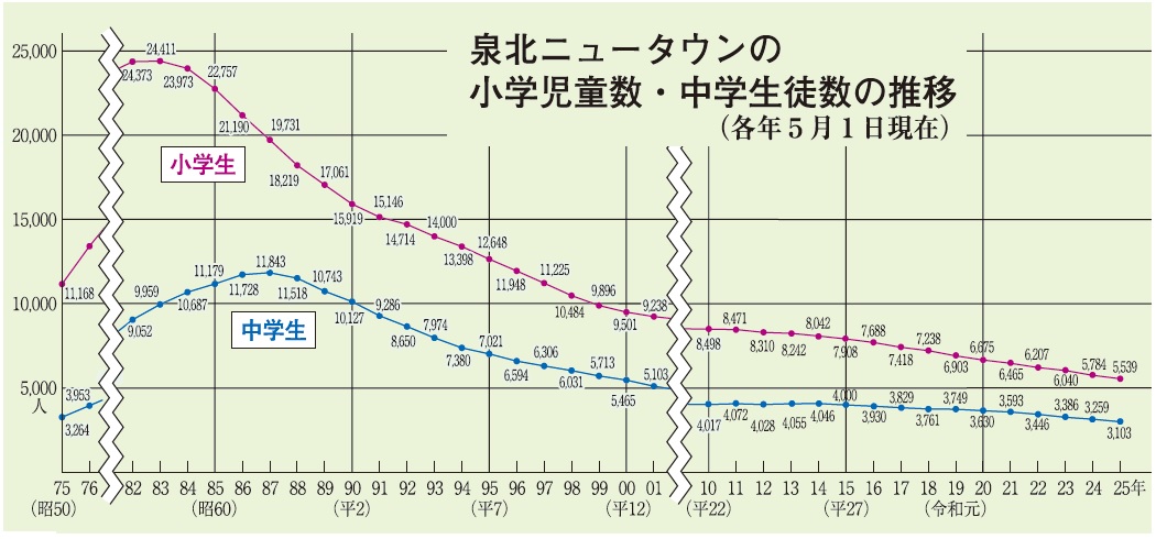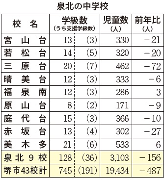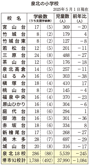 堺市教委が公表した2025年5月1日現在の統計によると、市立学校に在籍するニュータウン内の小学生は昨年より245人減少し、5539人で、中学生は156人減少し、3103人となった。