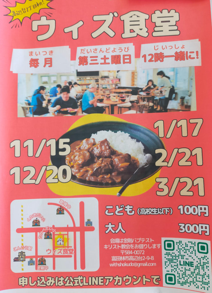 高辺台で「いっしょに食べる」をコンセプトにした子ども食堂「ウィズ食堂」が新設された。12月から本格始動し、毎月第3土曜日に金剛バプテスト・キリスト教会(高辺台2丁目9-8)で地域のみんなと食事を楽しむ場を提供する。