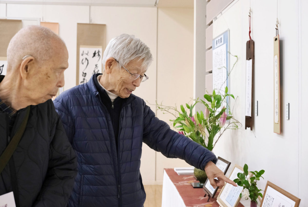 13日は俳句部在学30年の千本忠義さん(96歳)が在廊。慣用句を用いた作品「鎌研いで明日は早き小田刈らん」が展示されていた。「慣用句や他の色んな知識を持っている。たくさんの経験があって、知識がにじみ出る作品が多いのが特徴かもしれない」と解説してくれたのは、ともに学ぶ大場勝さんと原山桂子さん。