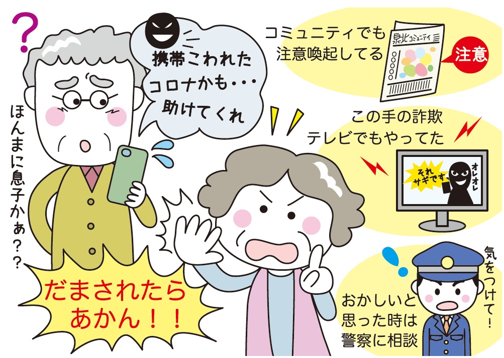 10月26日夜、堺市南区赤坂台の高齢者宅に息子をかたる男から「体調が悪い。コロナかもしれない。携帯が壊れたから新しい携帯で電話している」などの不審な電話。