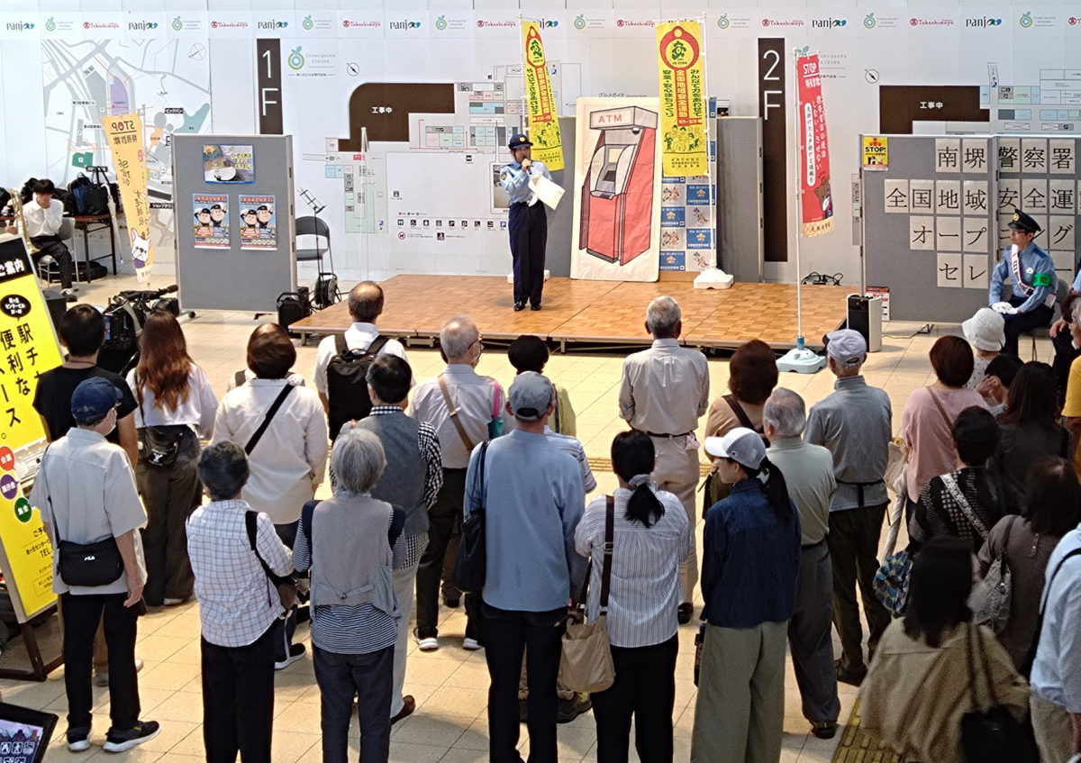 南堺署は10月11日、全国地域安全運動初日キャンペーンとして、情報番組のニュース解説などで活躍中の読売テレビアナウンサー野村明大(めいだい)さんを一日署長に迎え、10時~泉ケ丘駅前でオープニングセレモニーを行った。