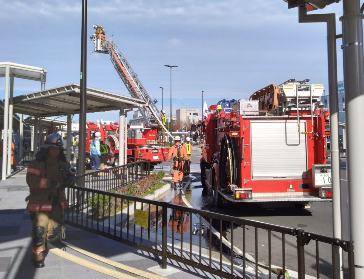 トナリエ前のロータリーには多くの消防車両が集まっており、幼い子どもを連れた親子は、消防車と写真を撮ったり放水する様子を見学していた。