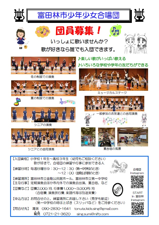 団員募集中。歌が好きな小学生~高校生(幼児も応相談)。募集人数15人。毎日曜9時半~12時半。金剛公民館ほか。月2千円(別途諸費用)
