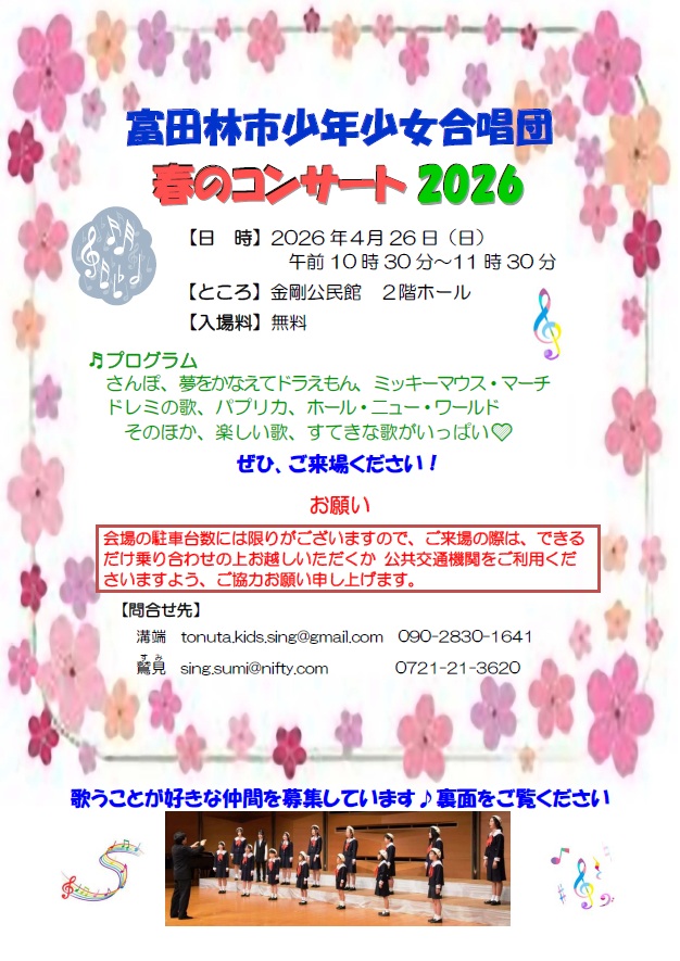 4月26日の10時半~11時半、金剛公民館2階ホールで富田林市少年少女合唱団による「春のコンサート」が開催される。