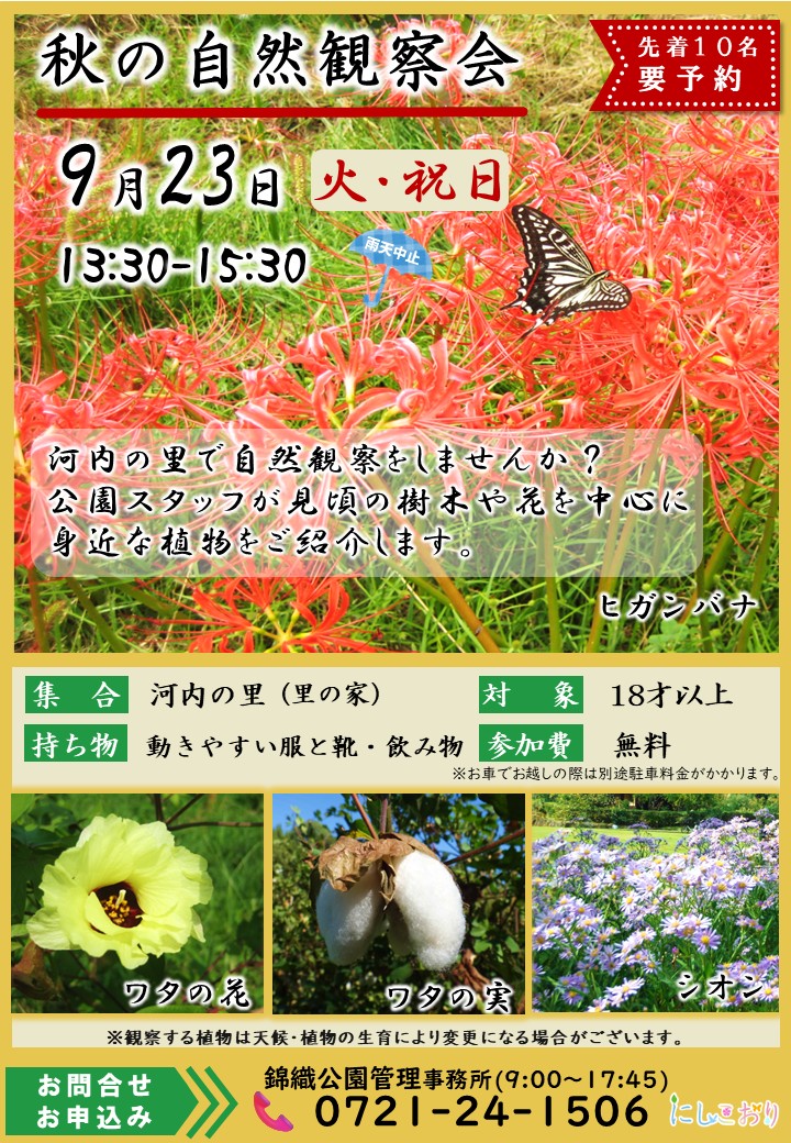 9月23日1時半〜3時半に錦織公園で「秋の自然観察会」が開催される。 ヒガンバナ、シオン、ワタの花や実、ナンバンギセルなど秋に見頃の植物を公園スタッフが案内。小さな山野草にも出会える。河内の里里の家に集合。参加費無料。対象18歳以上。定員先着10人(要予約、予約受け付け中)。動きやすい服と靴で。飲み物持参。雨天中止。