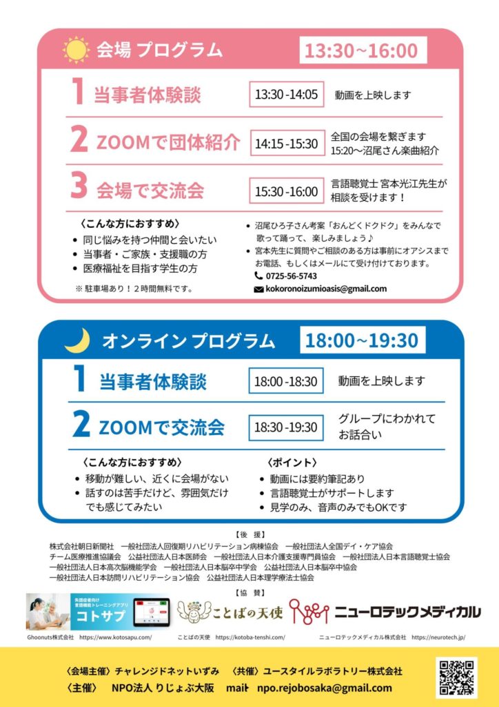 来場することが難しい人は夜6時からオンラインプログラム(動画に要約筆記あり。言語聴覚士がサポート。見学のみ音声のみでも可)が開催される。