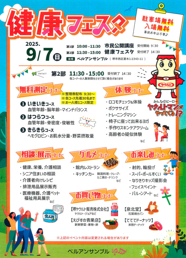 ベルアンサンブル(西区菱木)で9月7日、「健康フェスタ」が開かれる。市民公開講座とフェスティバルが同日開催。フェスタでは、無料測定・体験・グルメ・お買い物コーナーなど子どもから高齢者まで楽しめるプログラムがいっぱい。先着100人にヤクルト商品プレゼント。入場無料。駐車場無料。