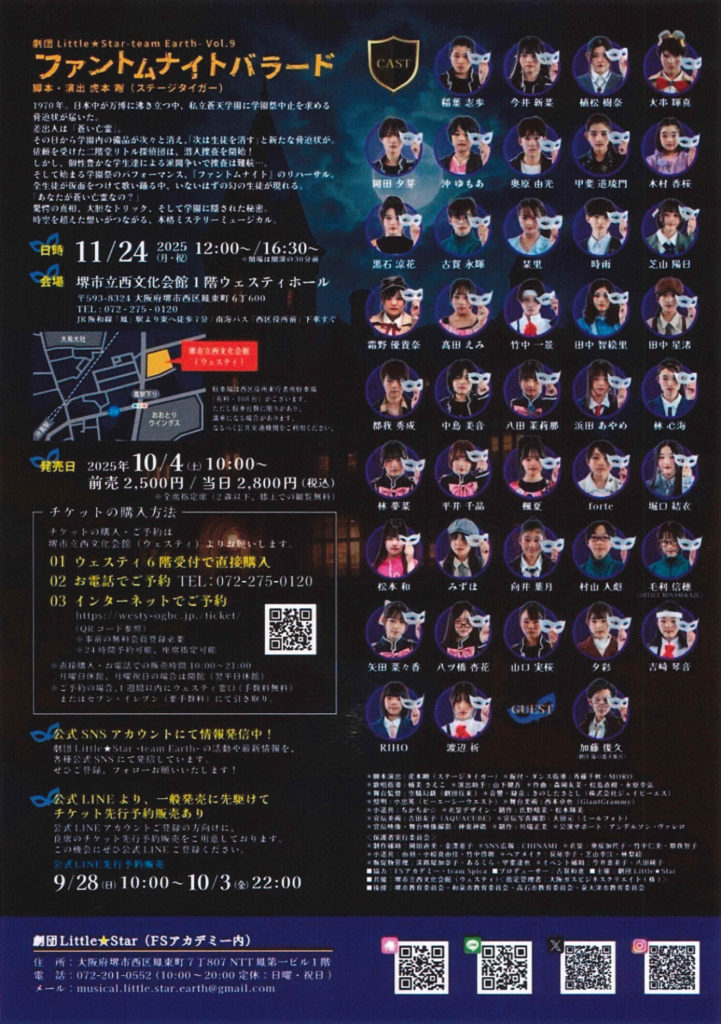 11月24日、本格ジュニアミュージカル劇団Little★Starの‐teamEarth‐が第9回「ファントムナイトバラード」を上演する。堺市立西文化会館ウェスティホール1階で12時と16時半の2回公演(開場は開演30分前)。