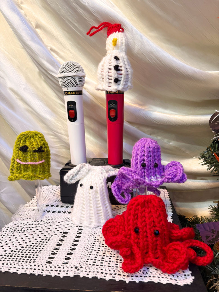 また受注製作で店主手づくりのマイクカバーを注文できる。モチーフはタコや雪だるまなど、詳しくは下記URLか直接電話で。金休・駐車場あり