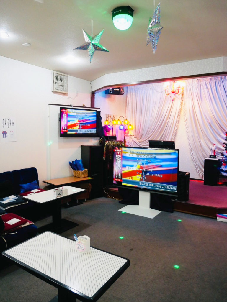 このたび、通信カラオケ機器とスピーカーを新調し、質の高い音響と臨場感を提供している。店内はステージ、テレビモニター5台、シャンデリアがあり、来店者は客席に対面するステージで歌唱することができる。おしゃれをしてステージで歌うと歌い手気分が楽しめると好評。もちろん着座のまま歌うのもOK。女性一人での来店も大歓迎。