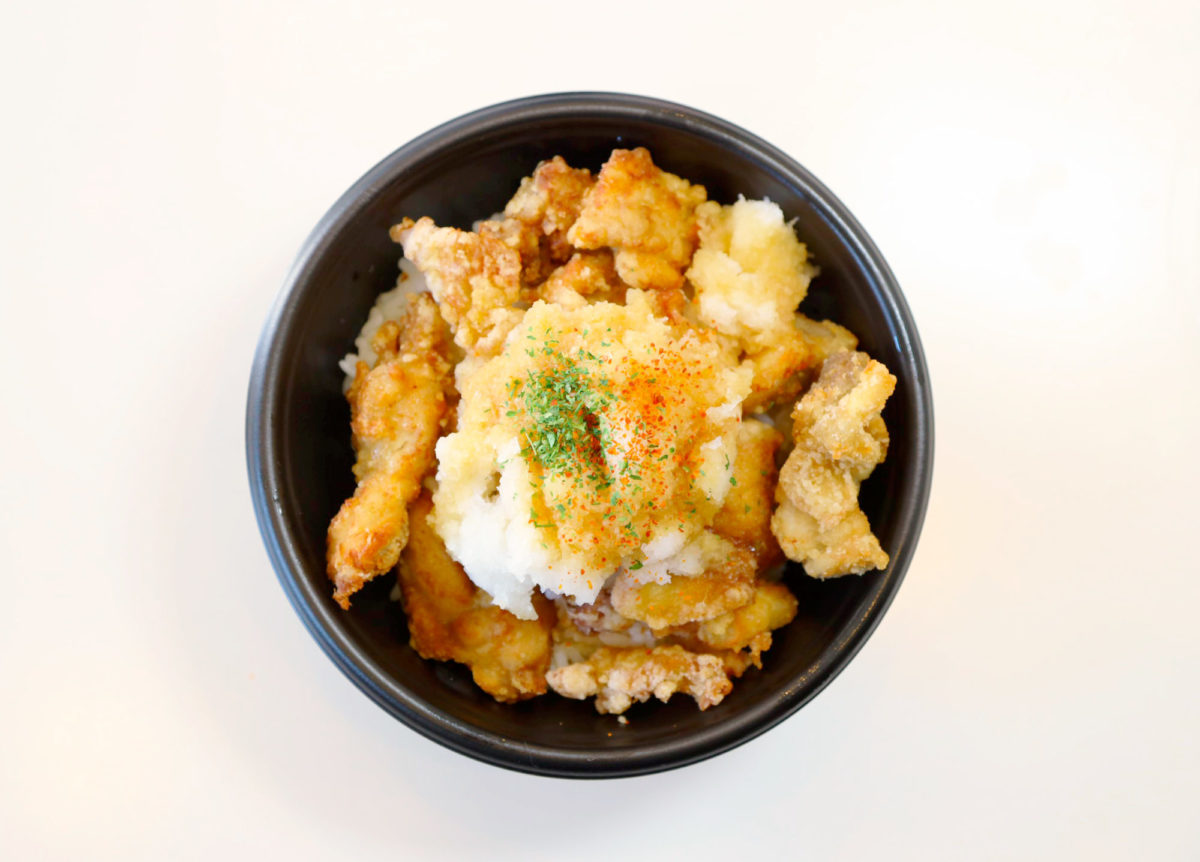 から揚げは、しょうゆ、ショウガ、ニンニク、こしょうを使ったシンプルな味付けで、衣はカラッと、中はジューシーで比較的うす味。単品は100グラム250円から販売する。店内のセルフトッピングで自家製の旨だれなど好みに応じて味を調整できる。「明太マヨ唐揚げ丼」550円、「おろしポン酢唐揚げ丼」550円、「卵とじ唐揚げ丼」650円などのメニューも。17時からは焼き鳥の限定販売もある。