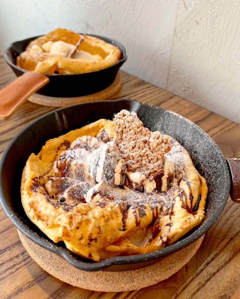 14時からオーダーできるグルテンフリーの卵たっぷりなシュー生地風パンケーキ「ナッツチョコバナナ」1300円は、外はサクサク、中はもっちりとした米粉生地にアイスをのせた一品。同店はテイクアウトメニューも充実。「ほっとする時間をお過ごしください」と話す。