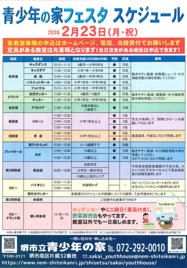 堺市立青少年の家(片蔵)で23日10時〜4時、4月からの教室無料体験イベント「青少年の家フェスタ」が開催される。