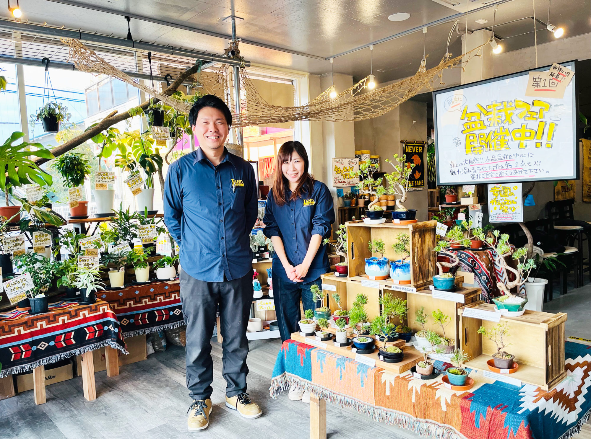 盆栽や観葉植物は雑貨の一部としての販売のため樹齢が浅く育てやすい盆栽を低価格で用意。カフェではボリュームたっぷりのランチメニューとこだわりのコーヒー。和泉市出身のオーナーの実家にある畑で育った柑橘果物も商品に。