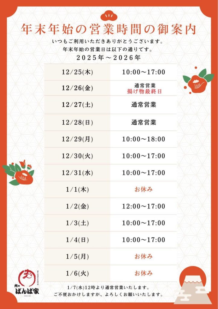 皆様の食卓が、笑顔と美味しいお肉で溢れる年末年始となりますよう、スタッフ一同、精一杯努めてまいります。