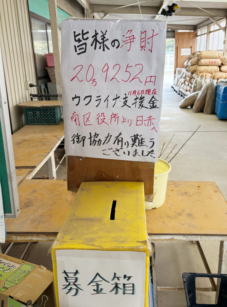 また、同館入口に鉢ヶ峯営農組合が行う「ウクライナへ」の募金箱を設置している。
