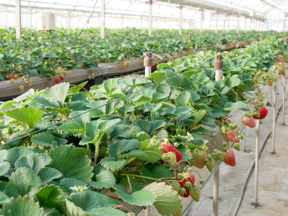 レジで受け付け後に、バスケットと持ち帰り用イチゴパック(12×17×7センチ)を持って専用ハウスへ入る。荷物は最小限で、足元はスニーカーなどがよい。ハウス内はイチゴを傷つけないようリュックなど大きな荷物は持ち込めない。高設栽培する3種類のイチゴは腰をかがめず楽に収穫できる。