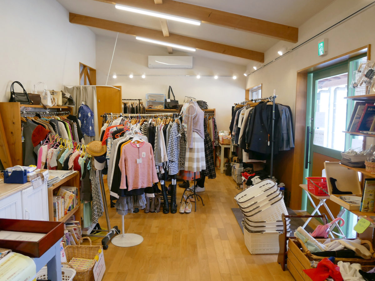 リサイクルショップは、衣類や靴、かばん、食器、花瓶、おもちゃなど多彩な雑貨が並び、Tシャツ200円、ワンピース500円、食器10円〜、本20円〜、着物300円、帯200円など「価格が魅力」と定期的にやって来る人が多い。